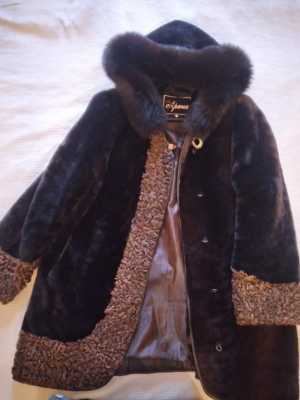 Шуба мутон, отделка каракуль,песец, цвет темный шоколад, длина по колено,новая.